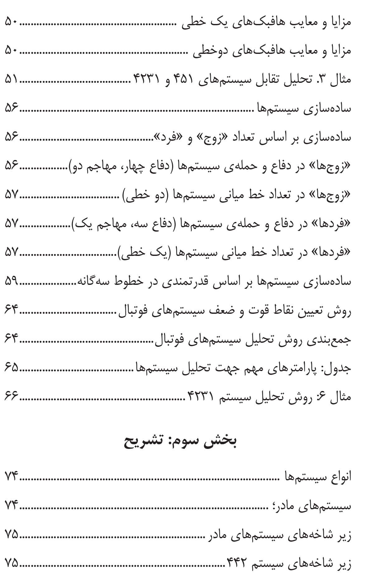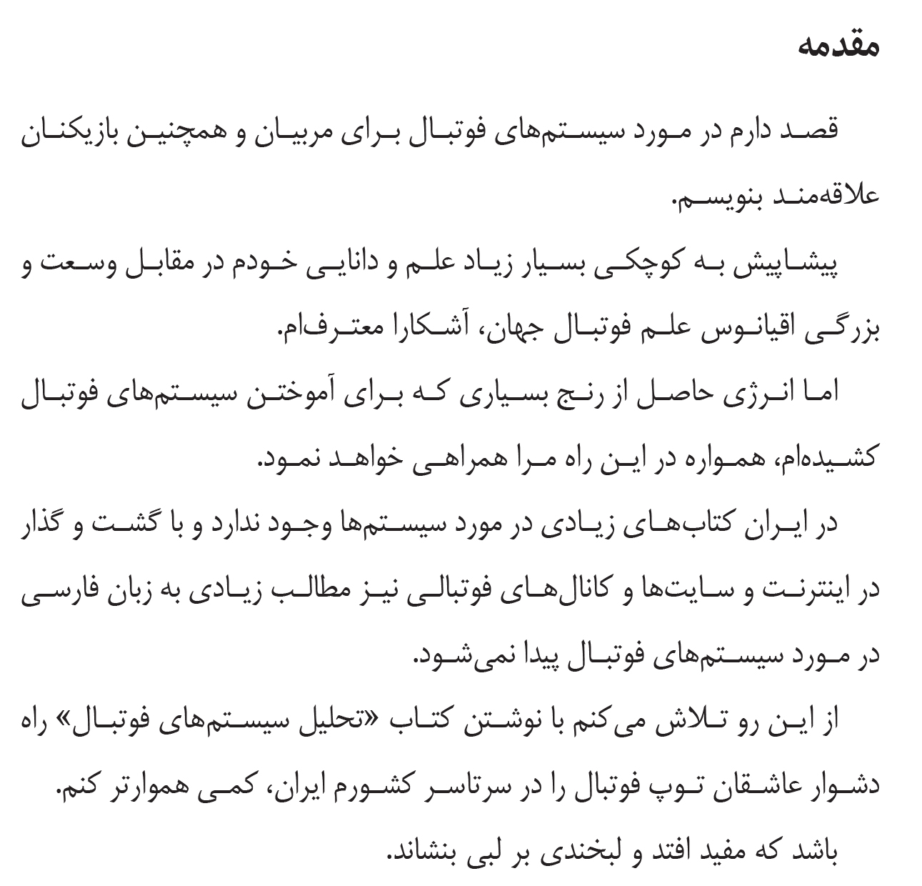 کتاب «تحلیل سیستم‌های فوتبال؛ نقاط قوت و ضعف» نوشته‌ی مهندس حمید جعفری نصرآبادی اثری تخصصی برای مربیان، بازیکنان و علاقه‌مندان فوتبال است که به بررسی علمی و دقیق سیستم‌های مختلف بازی می‌پردازد. در این کتاب، چیدمان‌های رایج فوتبالی مثل 4-4-2، 4-3-3، 3-5-2 و دیگر سیستم‌ها به‌صورت جزئی مورد تحلیل قرار گرفته‌اند. نویسنده نقاط قوت هر سیستم را برای شرایط مختلف مسابقه معرفی کرده و همچنین به نقاط ضعف و مشکلات احتمالی آن پرداخته است. این نگاه تحلیلی کمک می‌کند تا مربیان بتوانند با توجه به توانایی بازیکنان و شرایط تیم، بهترین سیستم را انتخاب کنند. کتاب با زبان ساده اما محتوای علمی نوشته شده و برای استفاده در فوتبال پایه و حرفه‌ای کاربرد دارد. همچنین مثال‌های عملی و مقایسه‌ای باعث می‌شود مخاطب درک بهتری از تاکتیک‌های مدرن داشته باشد. از ویژگی‌های مهم این کتاب، ارائه دیدگاه‌های کاربردی برای تمرین، مسابقه و تحلیل بازی‌ها است. مطالعه این اثر می‌تواند درک تاکتیکی مربیان و بازیکنان را ارتقا داده و نقش مهمی در موفقیت تیمی داشته باشد.