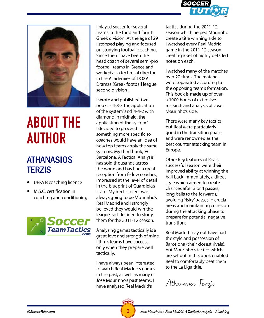 کتاب Jose Mourinho’s Real Madrid: A Tactical Analysis – Attacking نوشته‌ی ترزیس آتاناسیوس است و به بررسی جزئیات تاکتیکی تیم رئال مادرید در دوران مربیگری ژوزه مورینیو می‌پردازد. این اثر با تمرکز بر روی اصول هجومی، ساختار تیم، حرکات بدون توپ و سازمان‌دهی حملات، نشان می‌دهد که چگونه تیم مورینیو توانست یکی از خطرناک‌ترین تیم‌های اروپا شود. نویسنده با استفاده از نمودارها، دیاگرام‌ها و تحلیل‌های دقیق، موقعیت‌های مختلف بازی مانند ضدحمله‌ها، حملات سریع، ترکیب‌های هجومی و حرکات بازیکنان کلیدی (مانند کریستیانو رونالدو) را شرح می‌دهد. کتاب به مربیان، آنالیزورها و حتی بازیکنان کمک می‌کند تا درک بهتری از فلسفه هجومی مورینیو داشته باشند. همچنین روش‌های تمرینی مرتبط با این سبک ارائه شده است تا بتوان آن‌ها را در تیم‌های مختلف پیاده کرد. این اثر یکی از منابع تخصصی محبوب در زمینه آموزش تاکتیک فوتبال محسوب می‌شود و هم به صورت تئوری و هم عملی ارزش بالایی دارد.