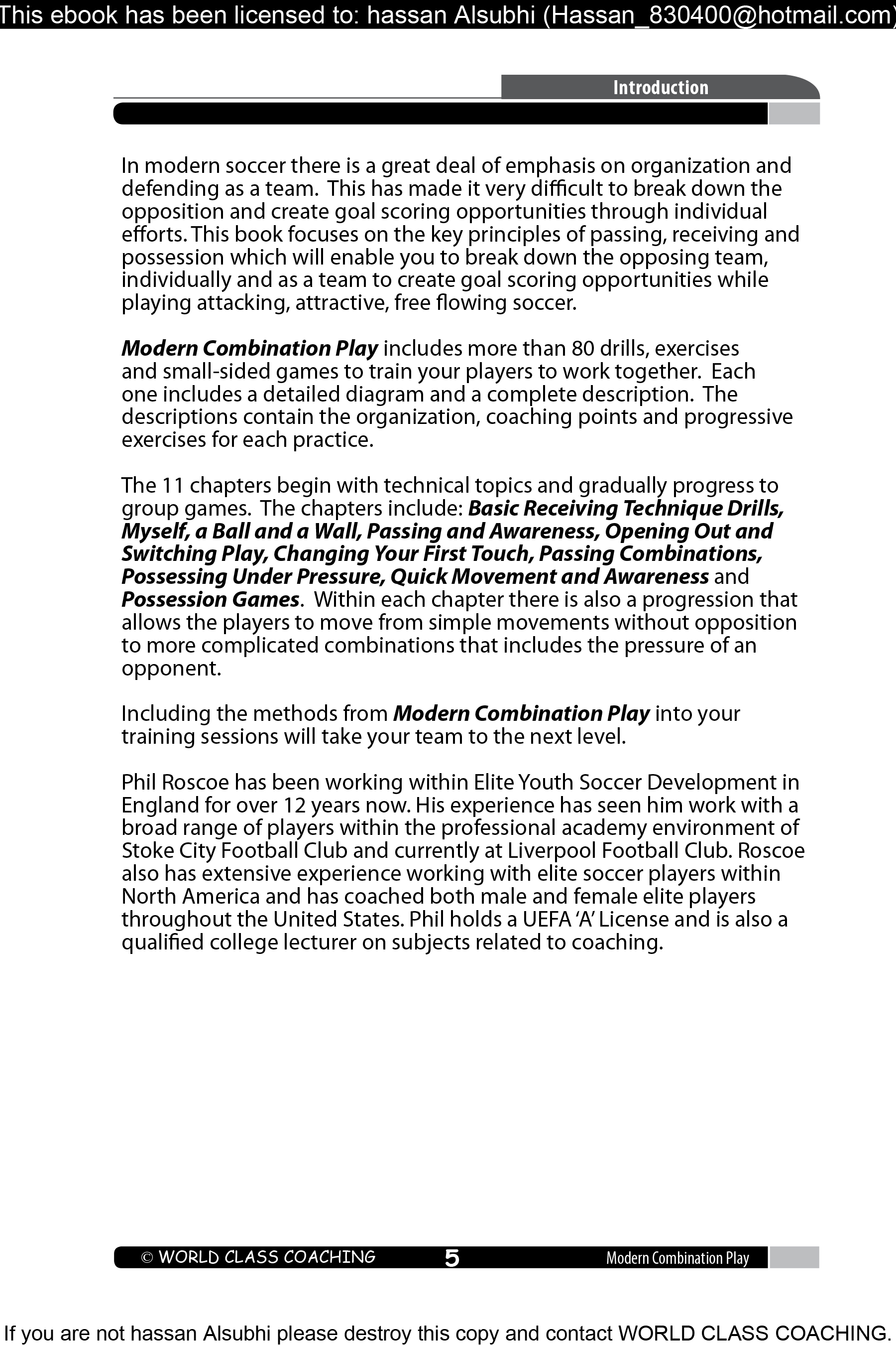کتاب Modern Combination Play نوشتهی Phil Roscoe توسط انتشارات World Class Coaching منتشر شده و به موضوع شیوههای نوین بازی ترکیبی در فوتبال میپردازد. این کتاب با هدف آموزش به مربیان و بازیکنان تهیه شده و روشهای مدرن برای ایجاد هماهنگی تیمی در حمله و دفاع را بررسی میکند. نویسنده با استفاده از تمرینهای متنوع، نحوهی ایجاد ارتباط مؤثر بین بازیکنان را توضیح میدهد. تاکتیکهای دو نفره و سه نفره، پاسکاری سریع، تغییر ریتم بازی و حرکات بدون توپ از محورهای اصلی کتاب هستند. تصاویر و نمودارهای آموزشی به درک بهتر تمرینها کمک میکنند. کتاب علاوه بر آموزش تکنیکها، به جنبههای ذهنی و تصمیمگیری در شرایط فشار هم میپردازد. همچنین نمونه تمرینهایی ارائه میدهد که مربیان میتوانند در جلسات تمرینی تیم خود پیاده کنند. تمرکز اصلی اثر بر بازی مدرن و سرعت بالای فوتبال امروز است. در کل، این کتاب مرجع مفیدی برای مربیانی است که میخواهند تیم خود را در سطحی بالاتر از نظر هماهنگی و ترکیبهای تاکتیکی هدایت کنند.