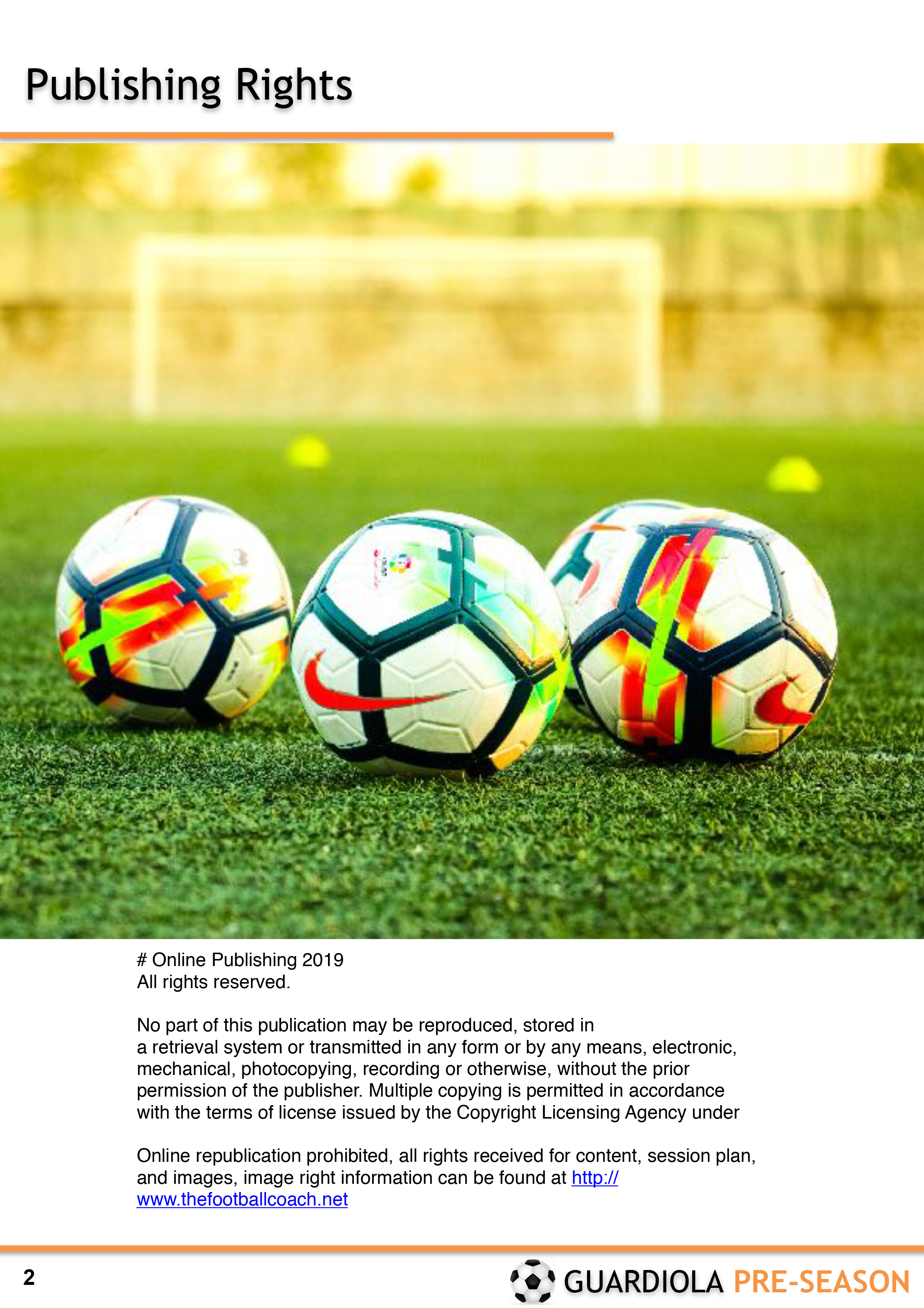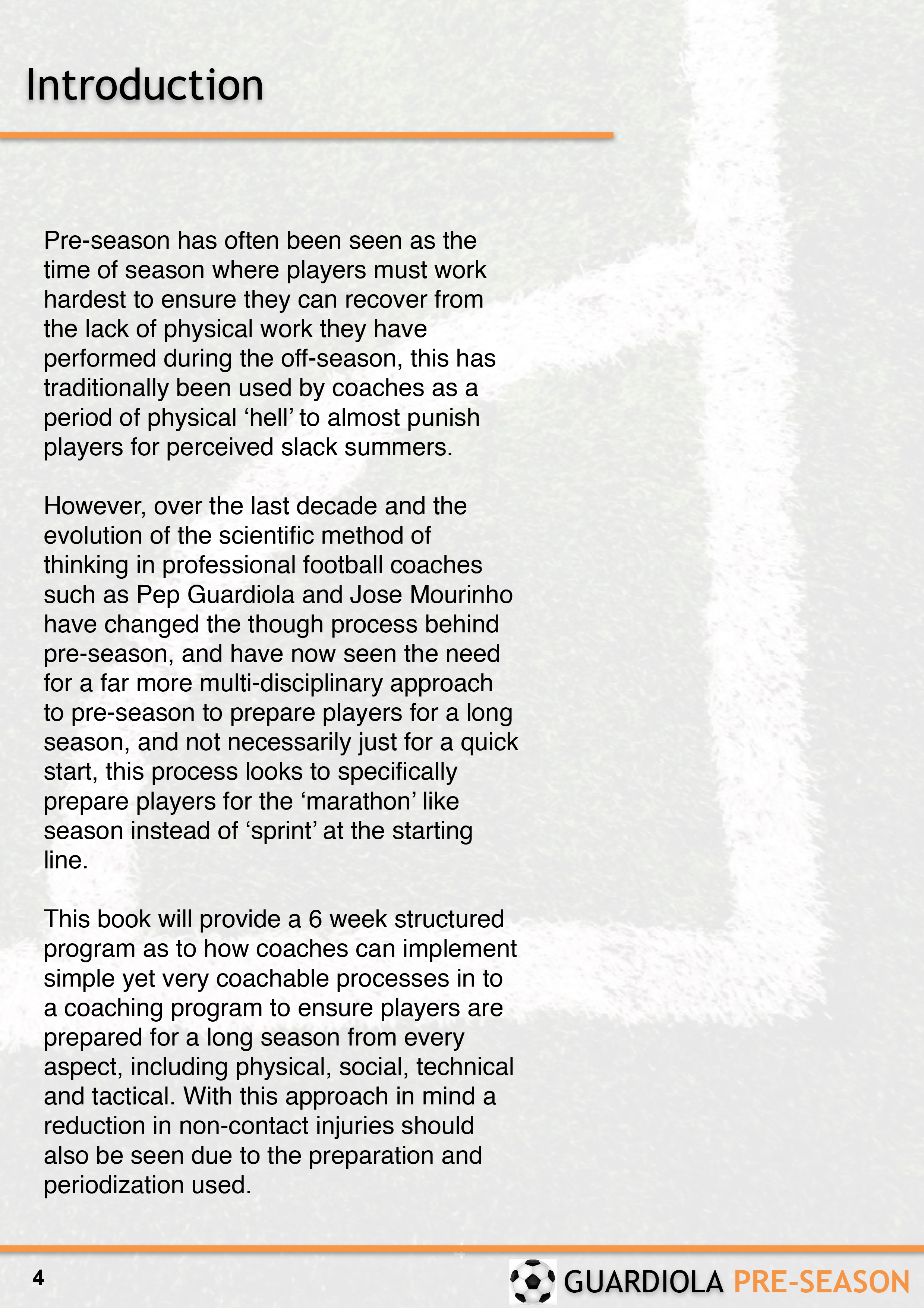 کتاب A Guardiola Designed Pre-Season Training Plan به بررسی برنامهی آمادهسازی پیشفصل طراحیشده توسط پپ گواردیولا میپردازد. این منبع نشان میدهد که چگونه یکی از بزرگترین مربیان دنیا از ابتدای فصل تیمش را از نظر فیزیکی، تاکتیکی و ذهنی آماده میکند. در این طرح تمرینات بدنی و استقامتی با کارهای تکنیکی و تاکتیکی ترکیب شدهاند. بخش مهمی از برنامه روی کار با توپ، پرسینگ، حفظ مالکیت و جابجایی سریع بازیکنان متمرکز است. ساختار تمرینات به گونهای طراحی شده که بازیکنان همزمان در شرایط مسابقه شبیهسازی شوند. جزئیات مربوط به تقسیمبندی جلسات تمرینی روزانه و هفتگی نیز ارائه شده است. این منبع علاوه بر تمرکز بر آمادگی جسمانی، بر جنبههای ذهنی و روانی بازیکنان تأکید میکند. نقش تحلیل ویدئویی و گفتوگوهای گروهی نیز در این برنامه پررنگ است. هدف کلی برنامه، ایجاد تیمی هماهنگ و منسجم است که بتواند با سرعت بالا و دقت تاکتیکی وارد فصل شود.